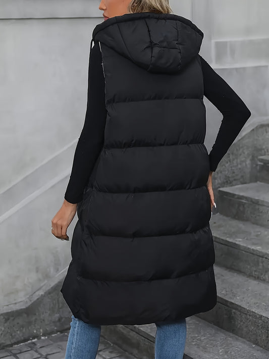 Zip-up Hoodie Puffy Vest - Casual Sleeveless Slant Pockets Vest - Warm Midi Vest For Fall & Winter