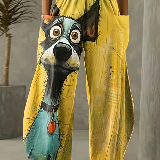 Casual Wide Leg Pants with Dog Print, Elastic Waist and Patched Pockets